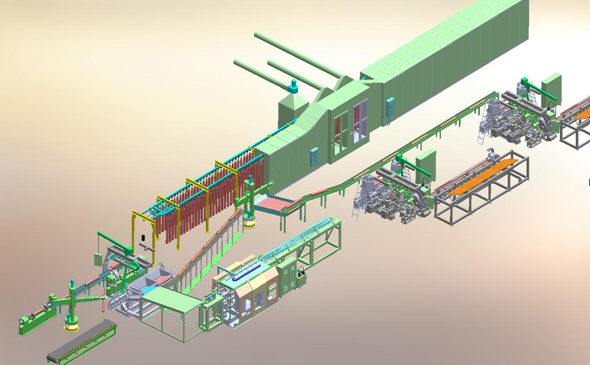 8、 自動(dòng)化輥皮涂裝線,采用自動(dòng)噴涂工藝,降低了勞動(dòng)強(qiáng)度,提高了功效,提高了外表美觀度,冷卻時(shí)的熱量又轉(zhuǎn)為采暖及生活用熱水,節(jié)約了能源。輥皮表面噴塑由5自由度機(jī)械手,配合懸掛輸送鏈,完成輥皮的自動(dòng)上下線;懸掛輸送鏈上設(shè)有自夾緊式專用吊具(專利)。
