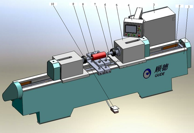 1床身 2傳動總成 3電控箱 4觸摸屏操控站 5左右機(jī)箱 6壓裝機(jī)具 7壓套桿 8輥皮支臺 9頂桿 10腳動開關(guān)